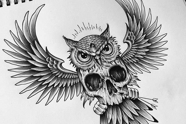 猫头鹰在西方象征毁灭,骷髅象征重生,死亡,两者结合具有生命的毁灭之意。