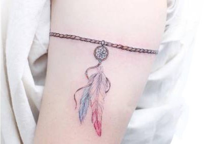 彩色羽毛臂环纹身,给人轻盈浪漫的感觉。