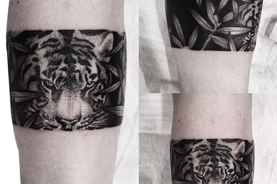 威风凛凛的老虎臂环纹身,眼神中透露出坚定的意志。