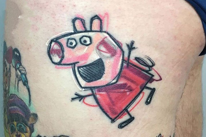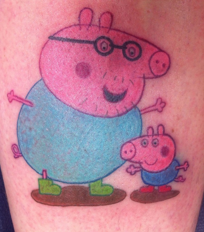 佩奇跟她的弟弟乔治的感情其实非常好,连喜欢吃的东西都是一样的。看这个纹身特意用一个心形把它们一起玩耍的一幕圈了起来,再加上蓝天白云与鲜花草地的背景,整个纹身看起来既具有童趣又非常有爱温馨。