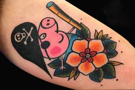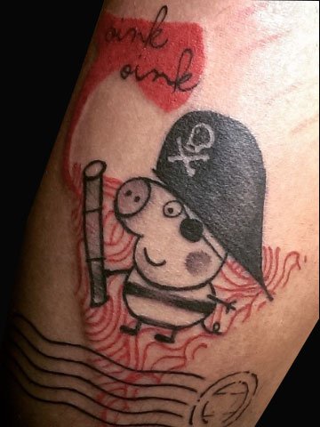 大家是不是以为这是佩奇呢?其实这是佩奇的弟弟乔治呢。喜欢恐龙的乔治不知道什么时候竟然成为了海盗,不过这个海盗造型好像还挺适合它的。想纹小猪佩奇纹身的男生可以考虑这款,因为不会显得太幼稚。