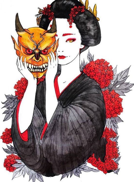在绣球花的簇拥之下,面容姣好的艺妓举起一张般若面具,一个面如止水,一个面目狰狞,却令一切有邪念之人难以靠近。