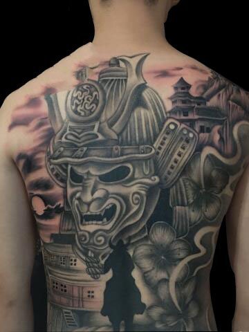 黑灰风格鬼武士满背纹身,展现男性果敢决断,英勇无畏的一面。