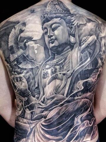 黑灰风格观音菩萨肖像满背纹身,你喜欢吗?