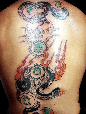 蛇纹身搭配梵文的满背纹身,带有宗教色彩,寓意向往美好!