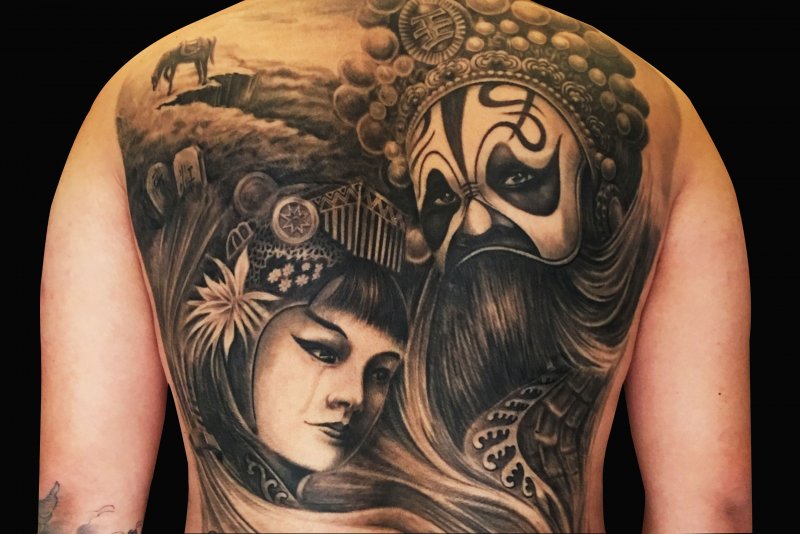 戏剧人物肖像满背纹身,带有浓浓的传统中国文化气息,体现了纹身者对中华传统文化的喜爱。