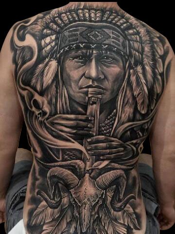 部落原住民人物肖像满背纹身。表达纹身者对原住民生活方式的向往。
