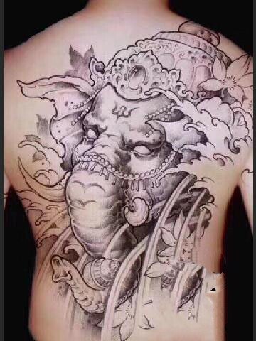 象神满背纹身。象神是印度宗教的守护神,象征财富,智慧,权利等等。所以,男性在背部纹象神是比较合适的哦!