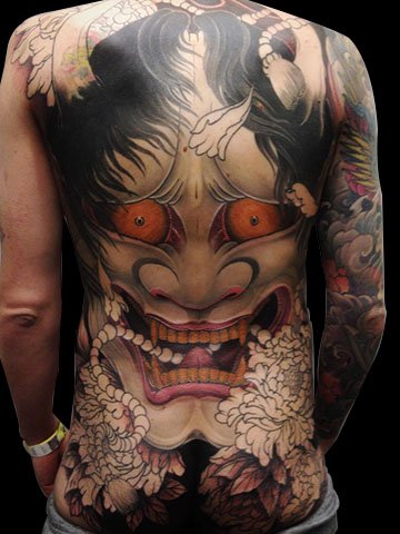 日本神话人物般若满背纹身。般若在日本神话中是一个充满怨气的角色,所以这个是阴性的纹身,如果你阳亢的厉害,需要中和一下的话,适合纹一个般若满背纹身。