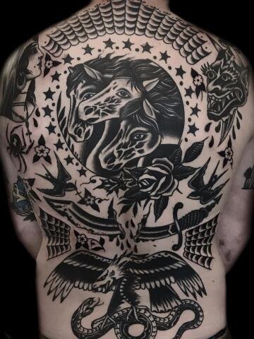 Old school风格的满背纹身。美女,骏马,鬼面,燕子蜘蛛,鹰和蛇,都是有驱除厄运,带给主人美好的意思。