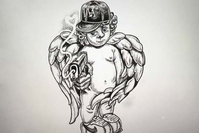 本是纯洁的天使,却戴上帽子将天使光环遮挡,收起丰满的羽翼,穿上硕大的鞋子,手中拿着冰冷的枪支。子弹出鞘,冒出的轻烟竟渐渐围绕成桃心,原来是乔装打扮的爱神在工作~