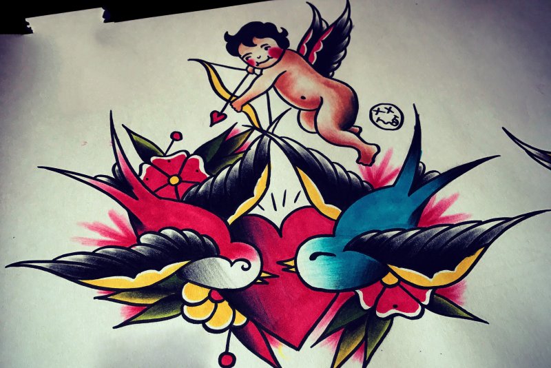 一蓝一红两只飞鸟在天空中相遇,生出的爱意促使了鲜花的盛放,爱神小天使置于二者之上,屏息凝神,认真地准备着下一次的“射击”。