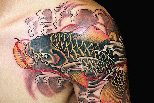 硕大的锦鲤口中衔着一枚串着红绳的钱币,在翻滚的浪花之中毅然向前,逆流而上,带来财富与吉祥。