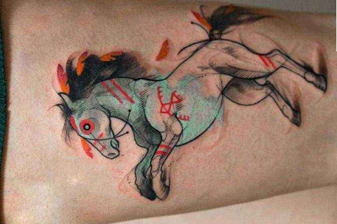 马的鬃毛与尾巴上散落着片片羽毛,身体上多处伤口,却依旧抬蹄嘶鸣。无论受多少次伤,都要保持初心,追求梦想。