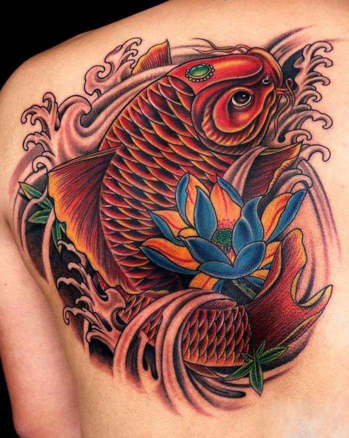 红色的锦鲤被翻滚的浪花掀出水面,头部竟镶嵌着碧绿的宝石,蕴含着好运与富贵。被锦鲤蜷在尾部的清廉娇艳盛放,纯洁,干净。