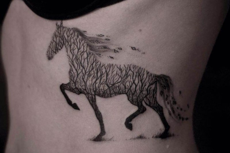马儿喜欢自由,常在草原上驰骋,随风飞起的鬃毛幻化为一颗颗树叶,身躯化为了树枝,又似细密的血管,充满生机,动力十足。