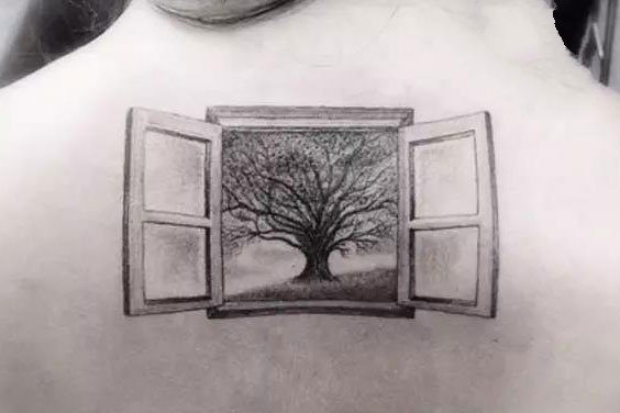 打开的几何窗户外面是一棵茂盛的大树,正植在你的背后,带有顽强的生命力,富有美好的寓意。