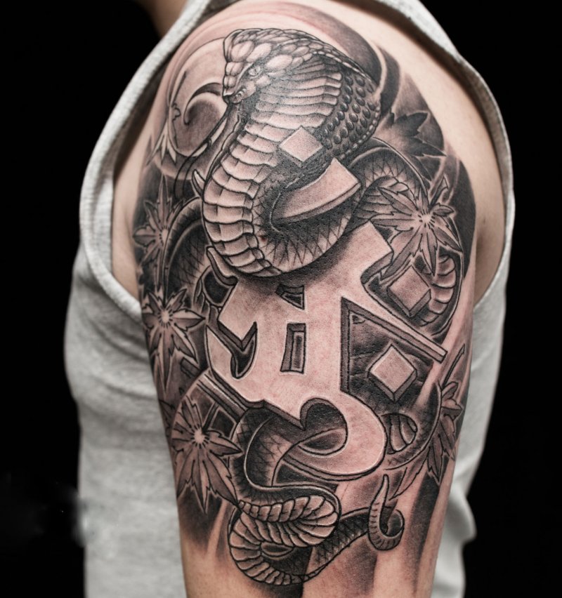 巨大的眼镜蛇吐着信子,将代表大日如来的梵文紧紧缠绕,周遭散落着数片枫叶,看似不在一个频道的三种事物,实则传递着长寿、富贵的寓意。
