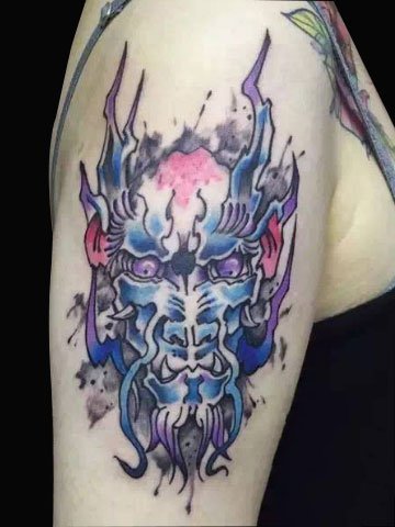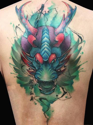 彩色龙头纹身,配合喷墨的技巧,引人注目,不失霸气的一面。十分特别的一款纹身。