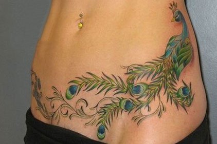绿色的孔雀纹身遮妊娠纹纹身,适合皮肤偏黄的肤色。