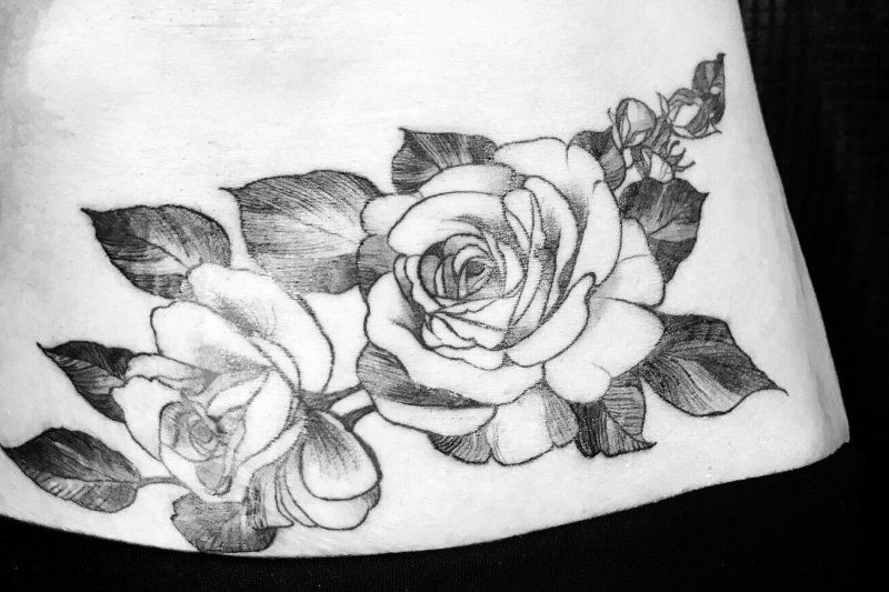 素描风格的玫瑰花妊娠纹遮盖纹身,高贵典雅。