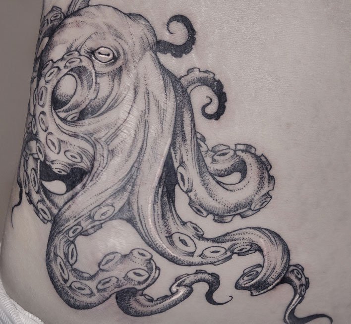 点刺风格的八爪鱼妊娠纹遮盖纹身,风格迥异。