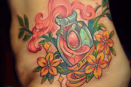 经典鲜花搭配镂空饰品纹身,遮盖大面积妊娠纹。也可以搭配英文“only death can make us apart “, (只有死亡才能把我们分开),寄托自己的情感。