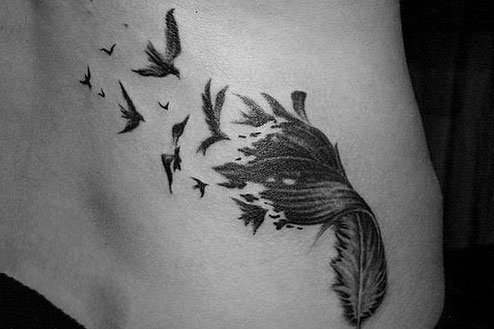 腰部一则的水墨羽毛遮盖妊娠纹纹身,时尚又美观。