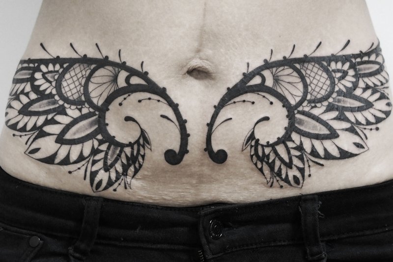 如果妊娠纹面积比较大,小编建议选择黑色风格的花纹图案纹身,这样时尚又健康。
