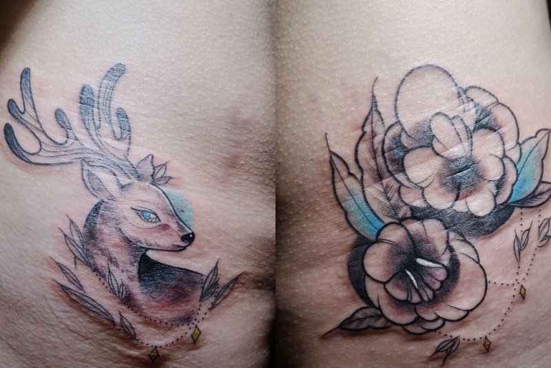 当然许多人对于纹身的理解不一样,有时候妈妈们需要鼓起巨大的勇气才敢去纹一个。这款清新的鹿纹身和花纹身,专门为遮盖侧腰的妊娠纹而设计。