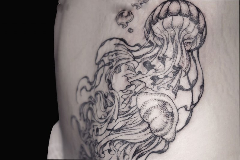 点刺风格的水母纹身,遮盖腹部小部分的妊娠纹。