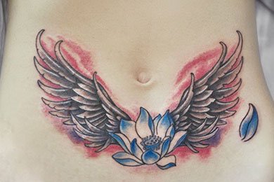 比起黑灰风格的妊娠纹遮盖纹身,彩色的可能会有提亮肤色的作用。比如点缀一些红色、蓝色,会让腹部看上去更美哦。