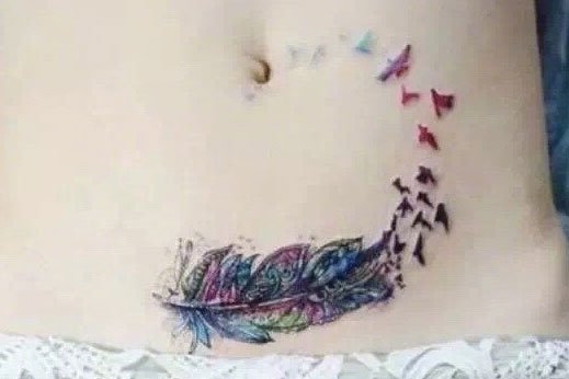 如果妊娠纹面积不大的话,纹一款小清新风格的彩绘羽毛纹身,也是不错的。