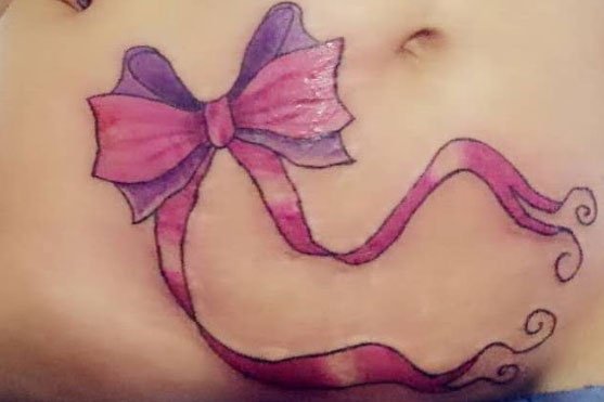 彩色可爱的蝴蝶结纹身图案,刚好遮盖妊娠纹,美观又实在,一举两得。