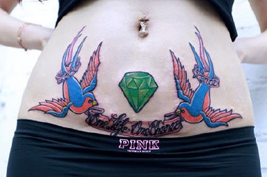 腹部的一款彩绘小燕子纹身,巧妙的对称设计,修饰女性腹部的体态美。