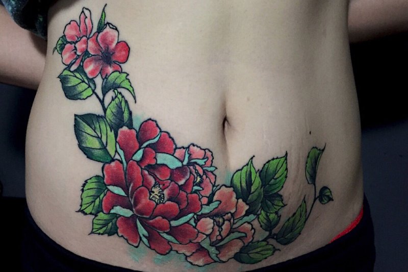 枣红色的花纹身遮盖妊娠纹纹身,不会显得太过单调。