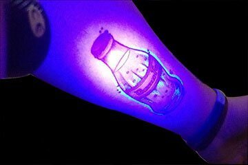 荧光纹身只有在特定的光源(譬如紫光灯)照射下,才会发出夺目的光彩。如果有些所谓的荧光纹身只要周围的环境一黑就能闪闪发光的,那都是混入对人体有害的荧光剂、粉,这些色料是不可以接触皮肤,更不能进入人体(敲黑板,注意!)