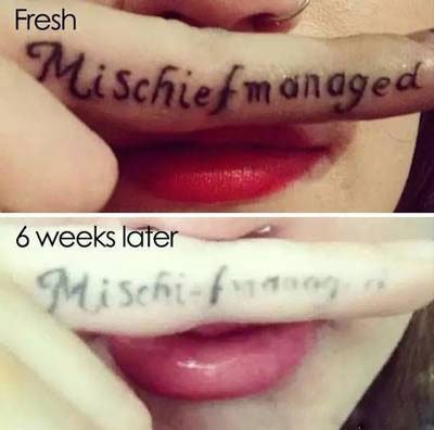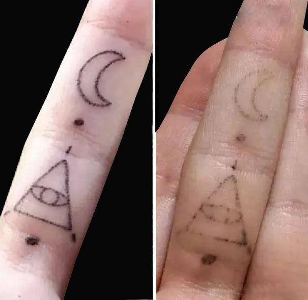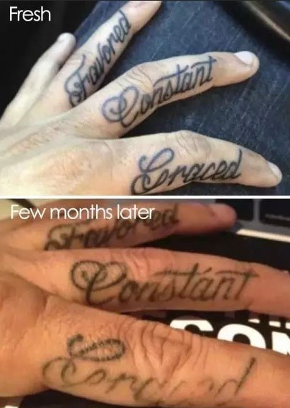 很多纹身,刚完成时呈现很好的效果,但很快就出现掉色的问题。例如,手指的皮肤表皮层很厚、纹身色料不合格,以及纹身后保养不当,都会导致图案褪色/晕色。