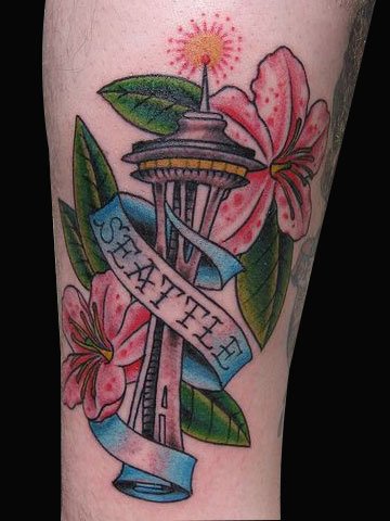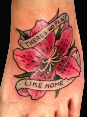脚背上的New School风格杜鹃花纹身,色彩大胆艳丽,加上飘逸的丝带缠绕,表达了对家庭的保护与爱!