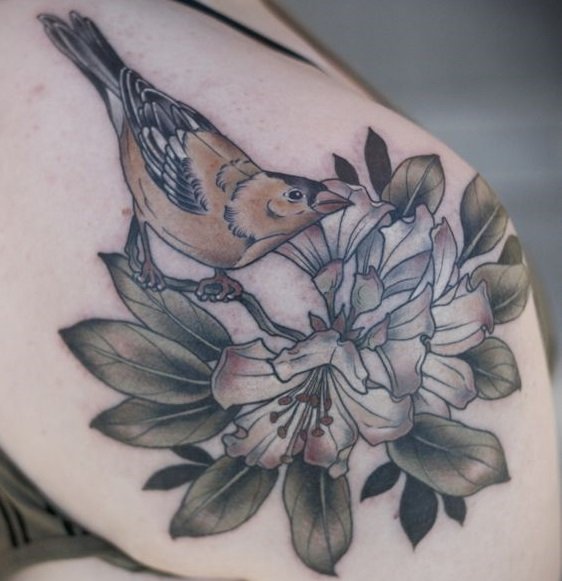 杜鹃花被誉为花中西施,花开灿烂,一直都受到人们的喜爱,把杜鹃花纹在身上寓意着国家繁荣富强和生活幸福美满。