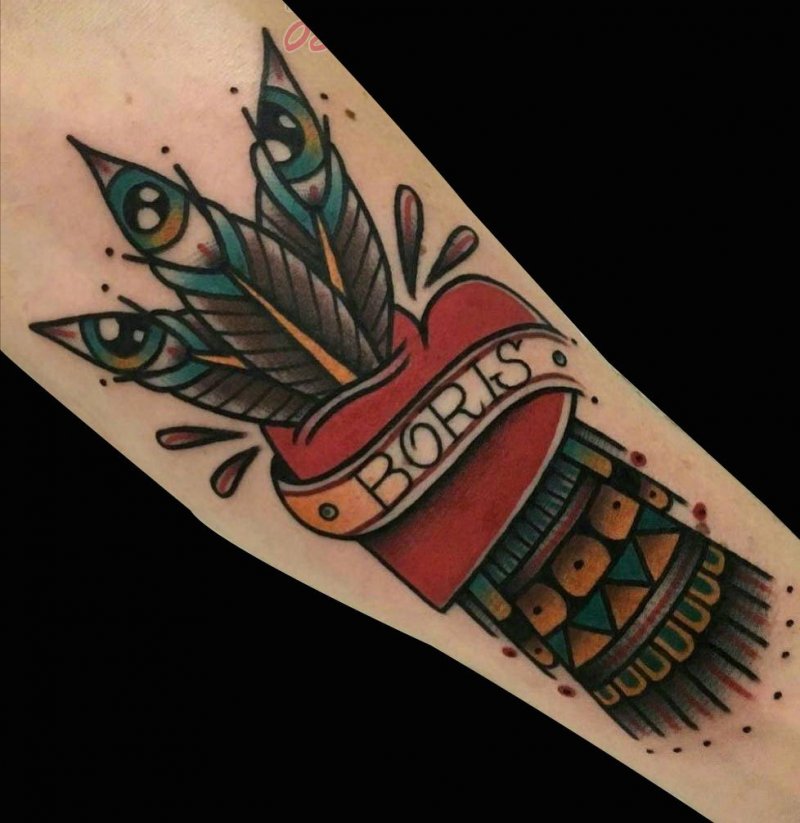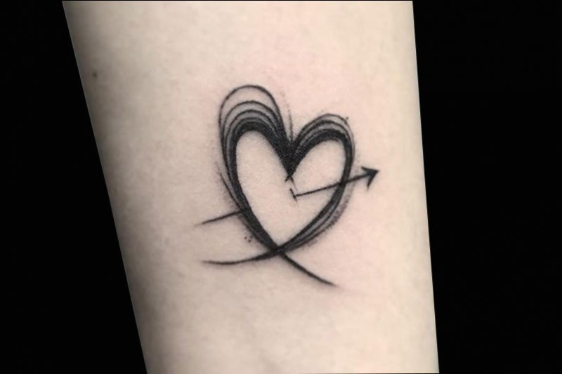 小臂黑灰线条爱心纹身图案,个性冷艳。