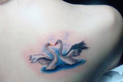 后背天鹅纹身图案,一对白天鹅夫妇在碧蓝的水中拨动着翅膀,十分唯美。