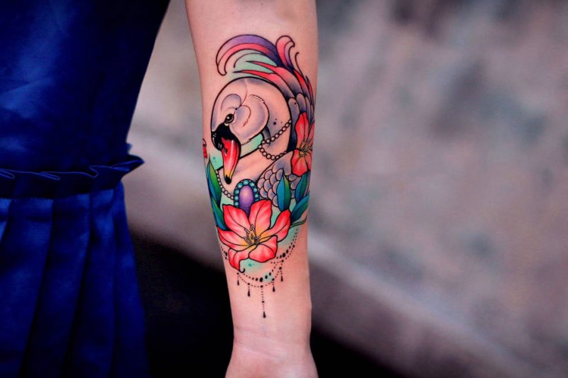 手腕小清新天鹅纹身,搭配小巧美丽的花朵,衬托天鹅的高贵。