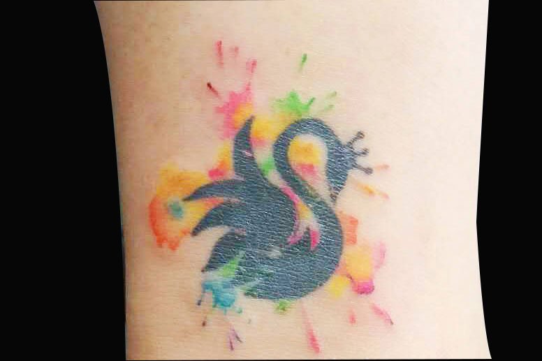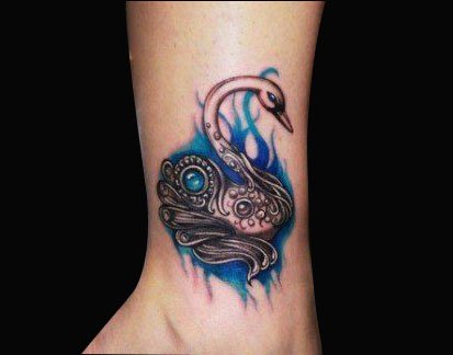 这款纹在脚踝处的喷绘彩色天鹅纹身图案,小巧美丽。