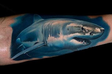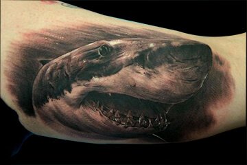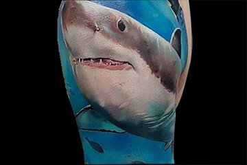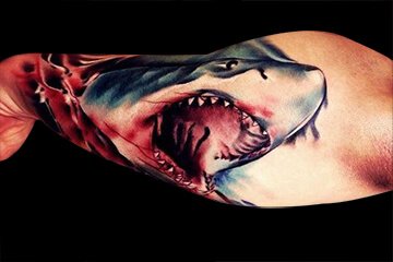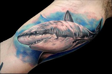 彩色写实风格的鲨鱼纹身,冷漠的眼神,微微上扬的嘴角,邪魅一笑露出森森白牙,哥让你看看谁才是这个海洋里的老大。