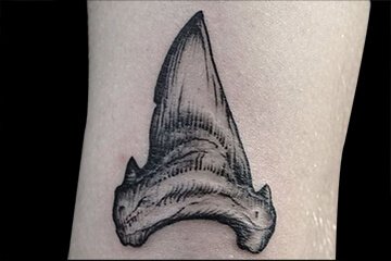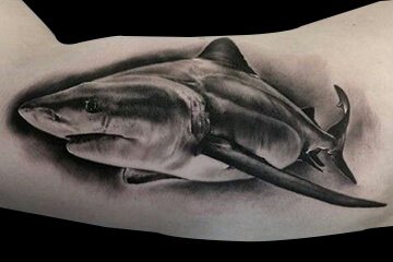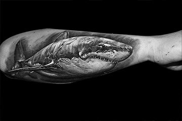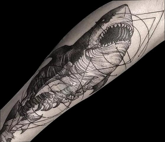 黑灰写实风格的鲨鱼纹身图案,它仿佛是来自五亿年前,那时候人类还只是一颗细小的尘埃。