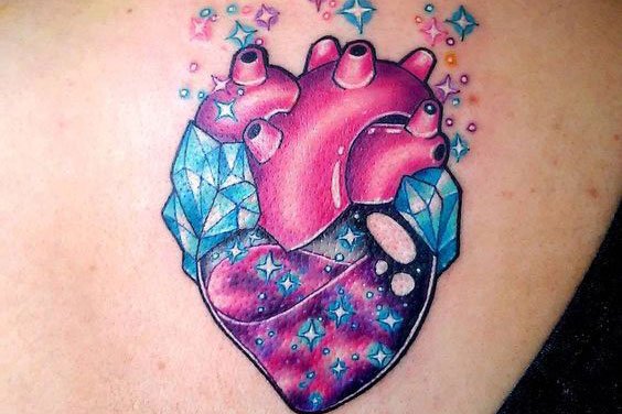 由许多星星与钻石装扮而成的彩色心脏纹身,正大发异彩,散发出生命之光!