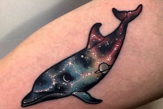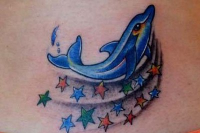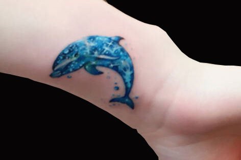 这款彩绘水彩星空元素蓝精灵海豚纹身图案,看上去十分唯美,精美别致。
