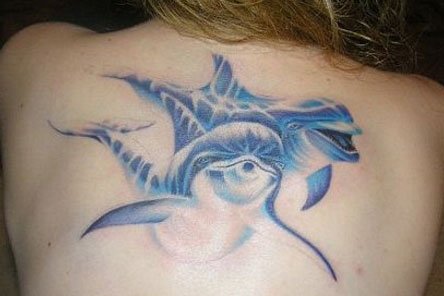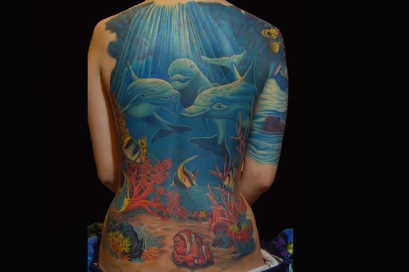 女生满背海底海豚与热带鱼,清新的蓝色海水搭配与灵动鱼儿、海豚的巧妙融合,创意、别具一格。