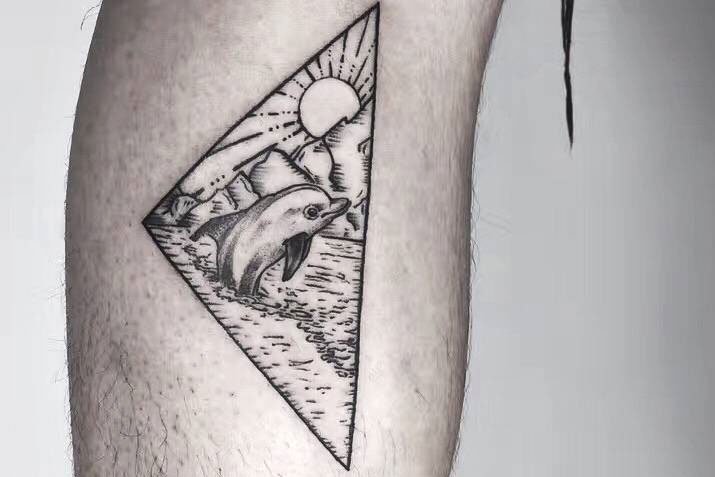小海豚跃出海面看晨曦的阳光,十分宁静的纹身图案。